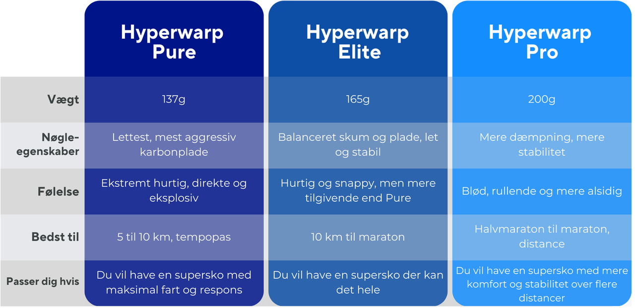 Hyperwarp Elite passer til mange løbere. Den er stadig tydeligt racingfokuseret, men med mere komfort og en smule mere stabilitet end Pure. Den fungerer også rigtig godt til tempopas og hårdere træningspas.